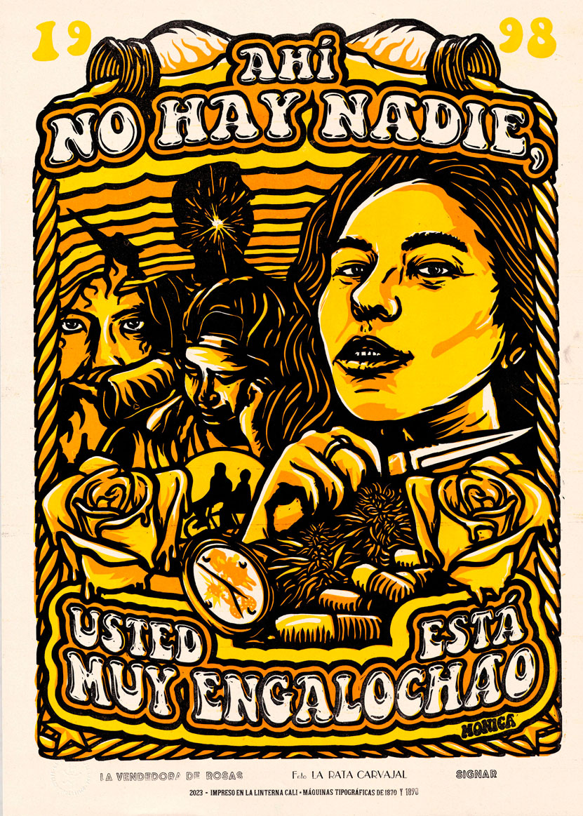 Cartel impreso en papel Earth Pact de 150 gramos, tallado sobre linóleo, por “Artistas Residentes” e impreso en maquinas de los años 1870 y 1890.