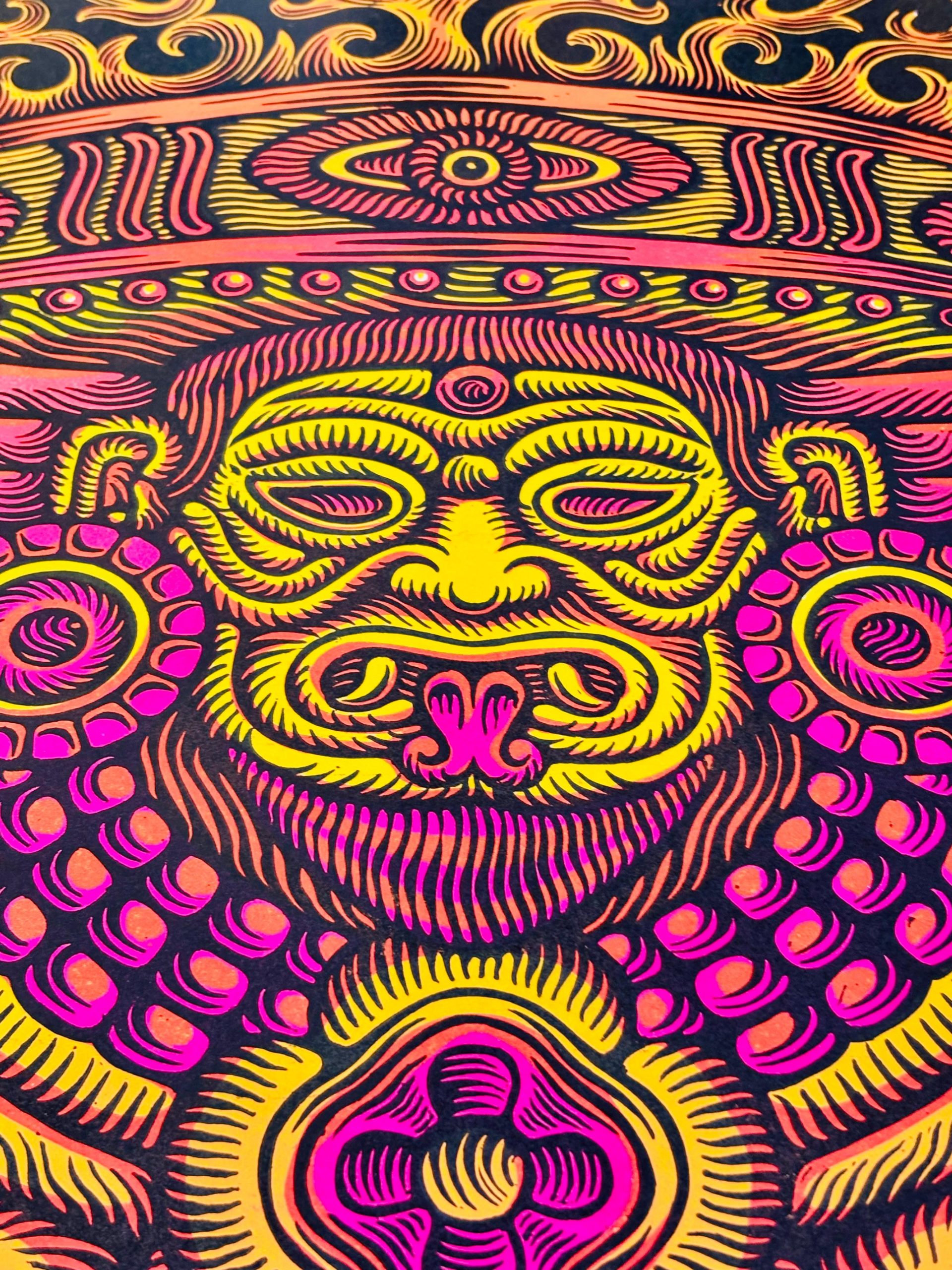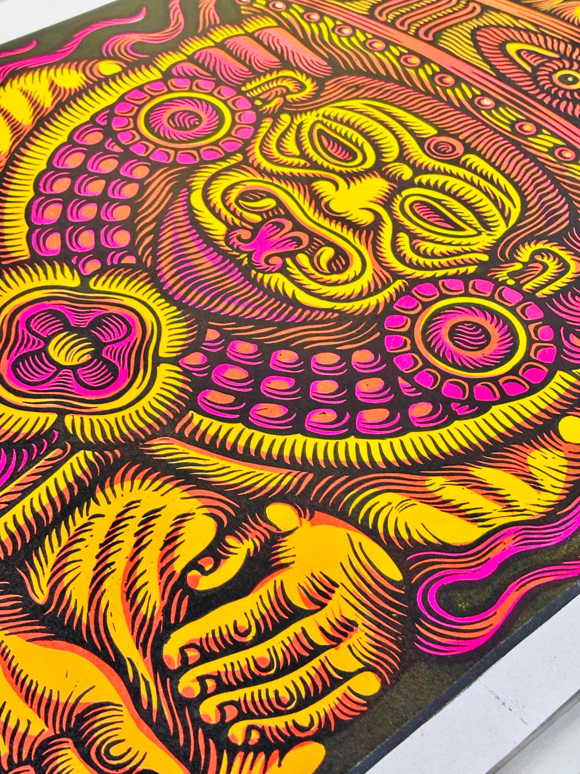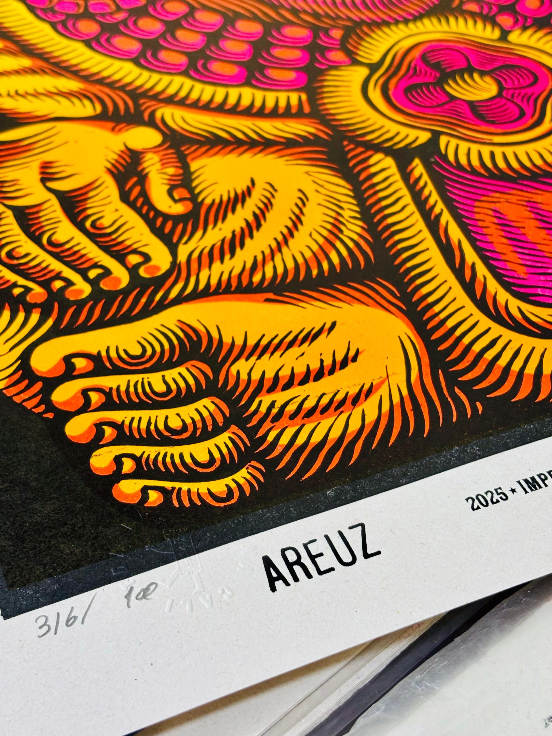 es una colección de linógrafas talladas a mano que rugen desde lo más profundo de la gráfica latinoamericana. En esta primera edición, seis artistas mexicanos trazan el camino de la fuerza simbólica del JAGUAR , símbolo ancestral de resistencia, visión y un corazón indomable.