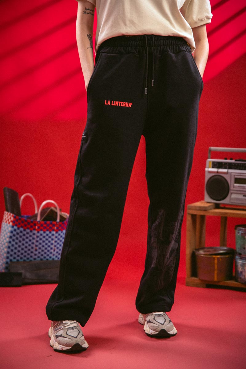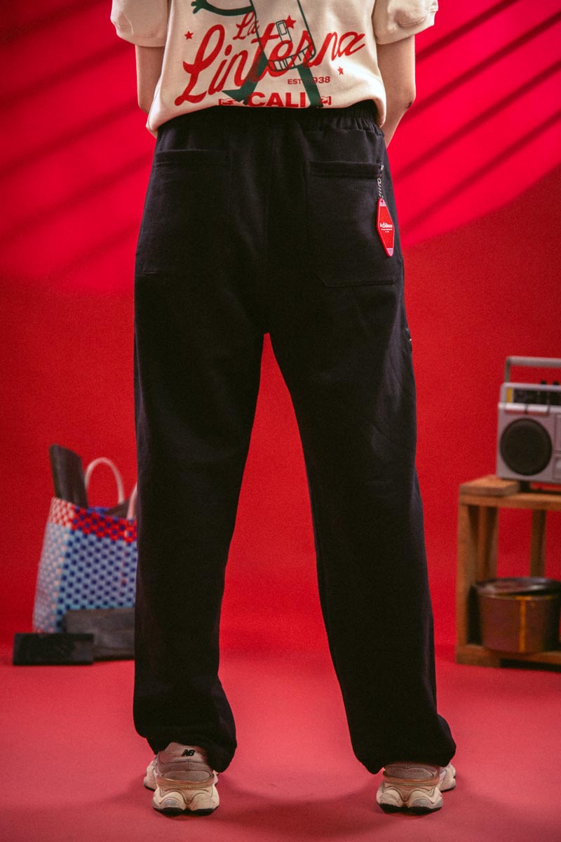 En el lado izquierdo, un estampado en bajo contraste de un ángel tipográfico aporta una carga simbólica y estética que conecta con el legado espiritual y gráfico de La Linterna. La parte frontal lleva el logo clásico en rojo, mientras que en la parte trasera incluye bolsillos amplios y una argolla con tag gráfico removible que funciona como llavero o acento visual.
