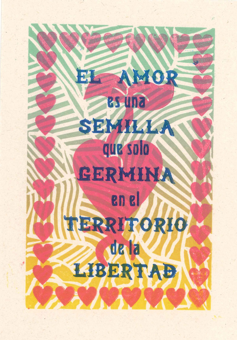 Postal en papel Earth Pact de 150 gramos, Tallado sobre linóleo, e impreso en maquinas de los años 1870 y 1890